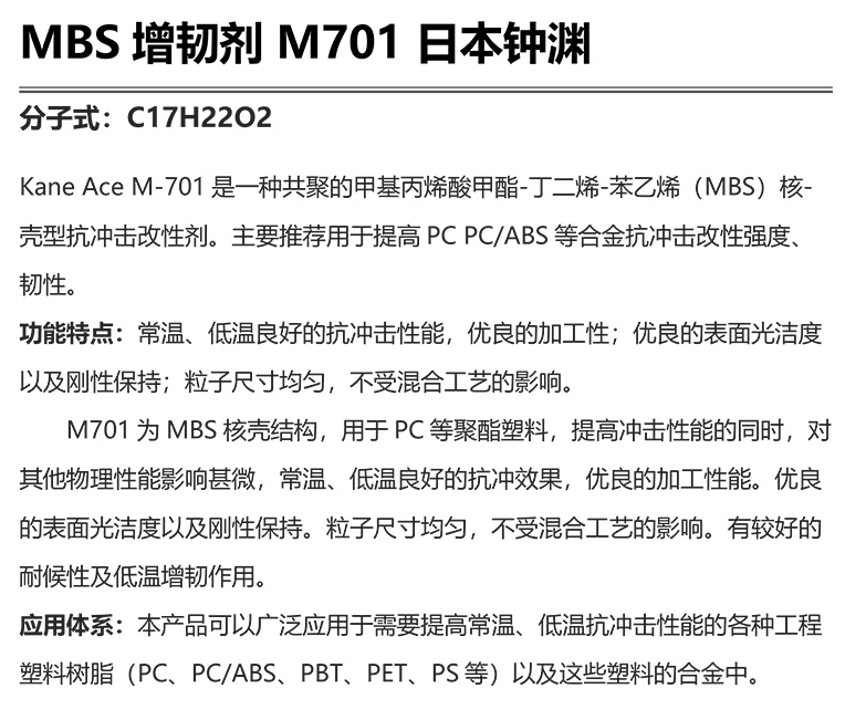 - 日本鐘淵MBS M701增韌劑 PC/ABS合金抗沖擊劑 增韌改性鐘淵mbs701 物性表, 日本鐘淵MBS M701增韌劑 PC/ABS合金抗沖擊劑 增韌改性鐘淵mbs701 產品參數,日本鐘淵MBS M701增韌劑 PC/ABS合金抗沖擊劑 增韌改性鐘淵mbs701 性能表,日本鐘淵MBS M701增韌劑 PC/ABS合金抗沖擊劑 增韌改性鐘淵mbs701 出廠報告, MSDS,, 物質安全資料表, UL黃卡,{ SGS報告, RoHS, 食品級認證, NSF飲用水標準, 產品資料, 產品性能, 出廠報告, 原廠原包, 代理商, 熱變形溫度, 熔指數, 流動系數, 抗沖擊性能、沖擊強度, 低溫韌性、低溫抗沖擊性能, 熔體流動系數、熔體流動速率, 加工工藝、加工參數、加工溫度, 歐盟RoHS 德國FDA 美國FDA 日本FDA
